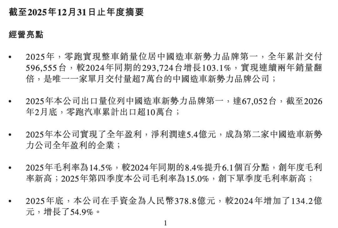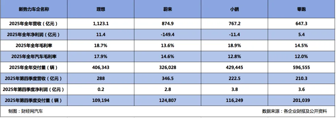 具体来看,理想、蔚来、小鹏和零跑,2025年全年营收分别为1123.1亿元、874.9亿元、767.2亿元和647.3亿元。其中,理想和零跑实现全年盈利,分别盈利11.4亿元和5.4亿元;小鹏和蔚来还处于亏损状态,净亏损分别为11.4亿元和149.4亿元。