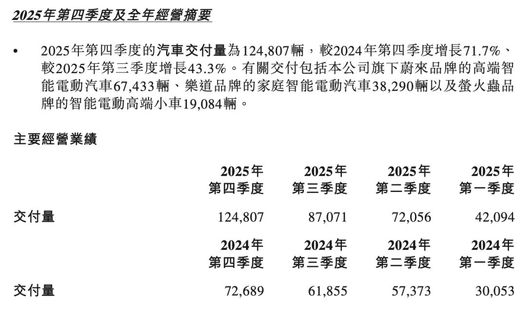 交付量方面,2025年全年蔚来交付326,028辆,其中第四季度交付124,807辆,同比增长71.7%。分品牌来看,旗下三大品牌季度交付量均创历史新高。蔚来品牌交付67,433辆;乐道品牌交付38,290辆;萤火虫交付19,084辆。