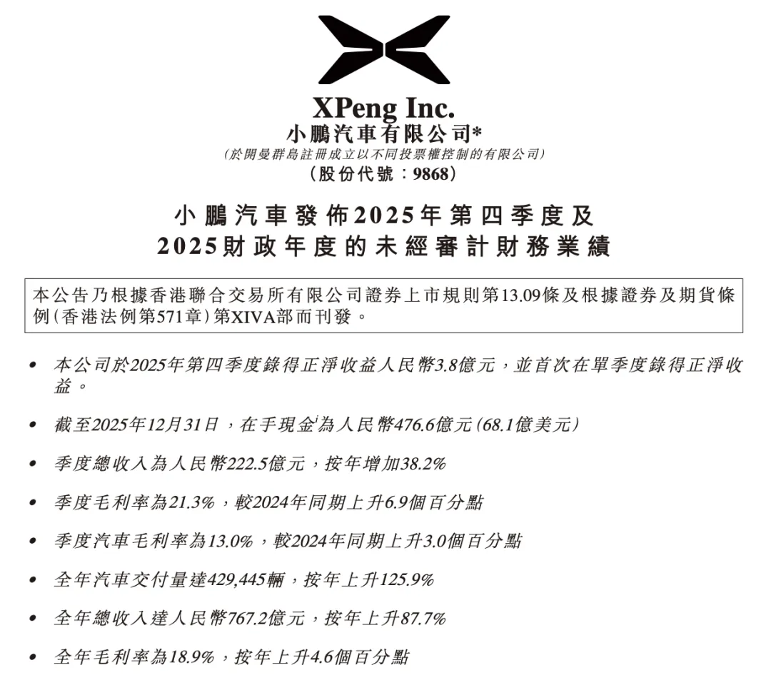 “2025年第四季度,小鹏汽车的毛利率达到21.3%,再创新高,净利润达到3.8亿元,我们通过以技术领先驱动的商业模式,达成了与传统车企迥异的盈利路径。”小鹏汽车副董事长及联席总裁顾宏地表示。