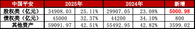 再看增量,仅中国平安一家,2025年在权益类资产的投资金额比2024年就增加了5000亿,在总资产中的占比,也升至25.11%,反观债权类投资,虽然金额小增,但占比下降。
