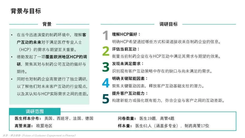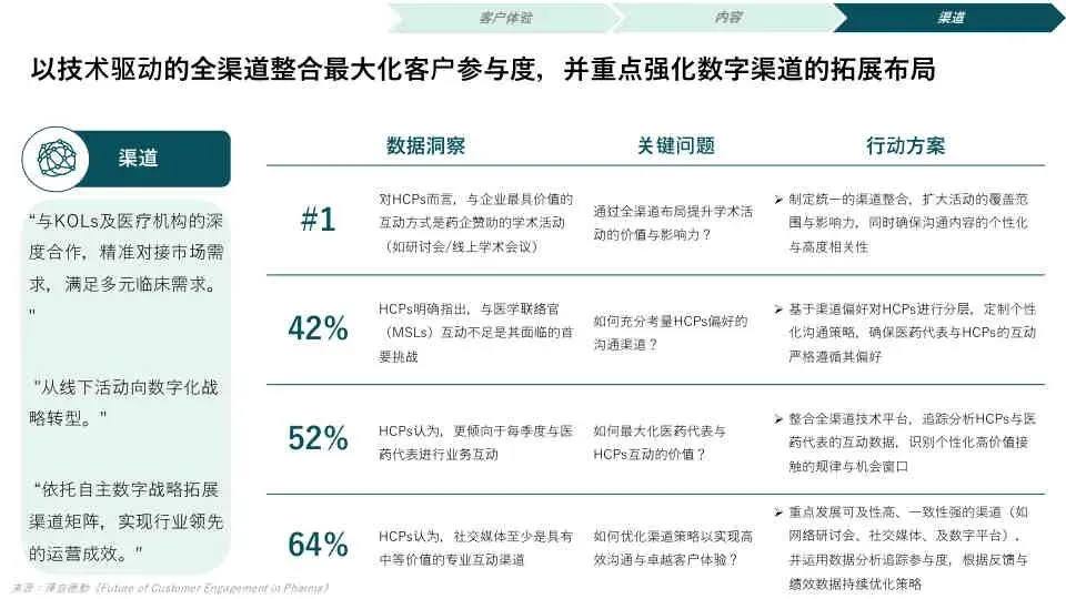 - 行动方案: 整合线上线下全渠道;基于HCP偏好分层定制沟通策略;重点发展网络研讨会、社交媒体等数字渠道。