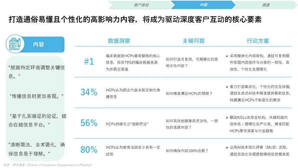 - HCP痛点: 79%的临床数据来自非药企渠道;34%认为代表信息传递不够定制化。
