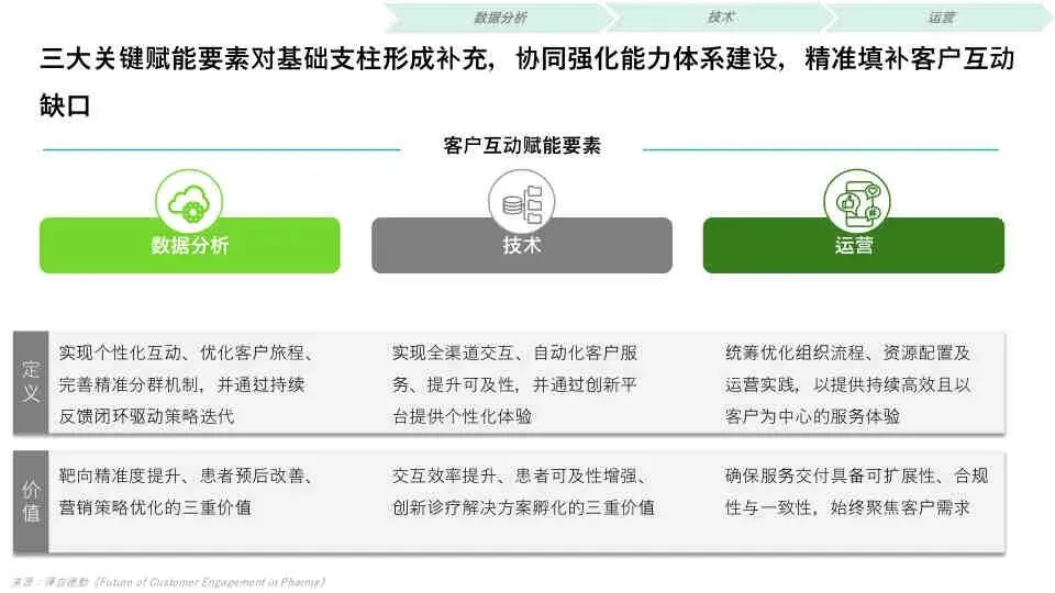 当前医药行业的客户互动模式存在巨大的“感知鸿沟”——超过80%的企业高管对现有策略感到满意,但仅有不到28%的医疗专业人士(HCP)认为企业很好地满足了他们的需求。要弥合这一鸿沟,医药企业必须彻底摒弃以产品为中心的传统模式,转向一个以客户(HCP)为中心、数据驱动、全渠道整合的价值型互动新范式。这一转型需要围绕三大基础支柱(客户体验、内容、渠道)和三大赋能要素(数据分析、技术、运营)进行系统性重构。