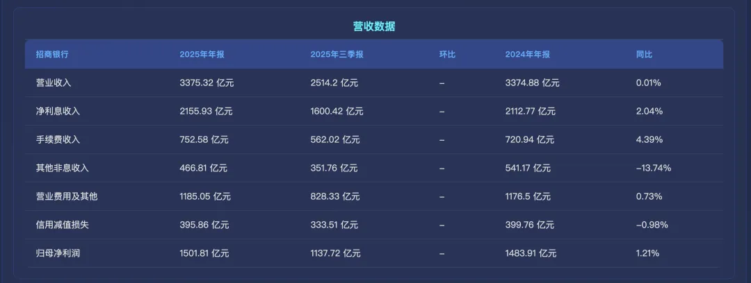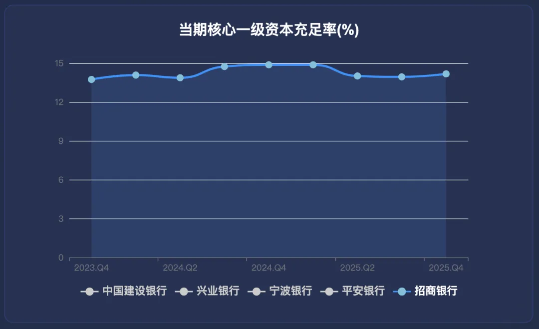 2024年核心一级资本充足率为14.86%, 2025年三季度为13.93%, 2025年度为14.16%, 环比增加了 0.23 个百分点,同比减少了 0.7 个百分点. 也就是说, 虽然相对于三季度有所提升, 但是同比还是下降了不少的, 但是好在招行银行的核心一级资本充足率本身就很高, 储备粮够用.