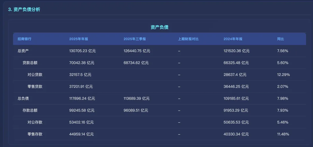 总资产 130705.23 亿元同比增长 7.56%,其中贷款总额70042.38 亿元,同比增速 5.6%。总负债 117896.24 亿元同比增长 7.98%,其中存款 99245.58亿元,同比增长 7.93%。财报数据显示,贷款增速低于总资产增速,说明零售信贷需求不足和政府发债增加。零售存款同比增加 11.48%, 零售端的优势还是继续保持。