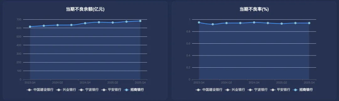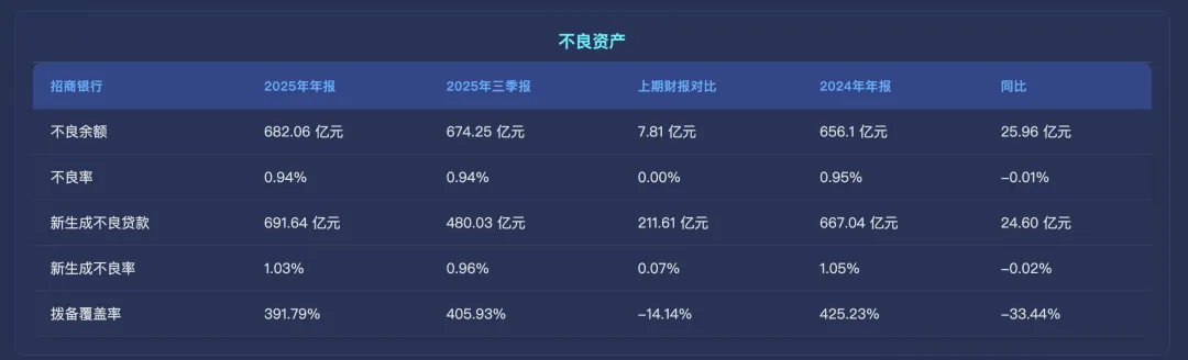 根据财报,不良余额 682.06 亿元环比 674.25 亿元增加了 7.81 亿元,不良率 0.94%和三季度持平, 和2024年报相比降低了一个百分点。