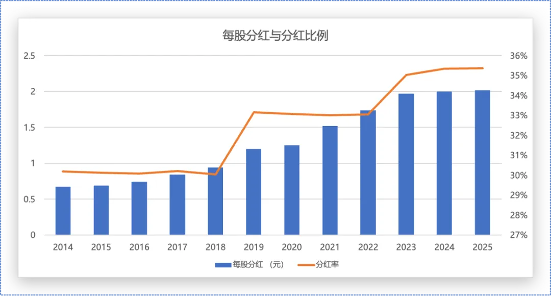 2025年招行每股现金分红人民币2.016元 (含税) , 扣除已派发的2025年度中期现金股息后,本次每股现金分红人民币1.003元(含税),分红比例为35.34%,跟去年基本齐平,按招行当前每股39.44元的价格计算招行当前的股息率为5.11%。但全年分红金额同比增长0.8%,低于净利润增速。
