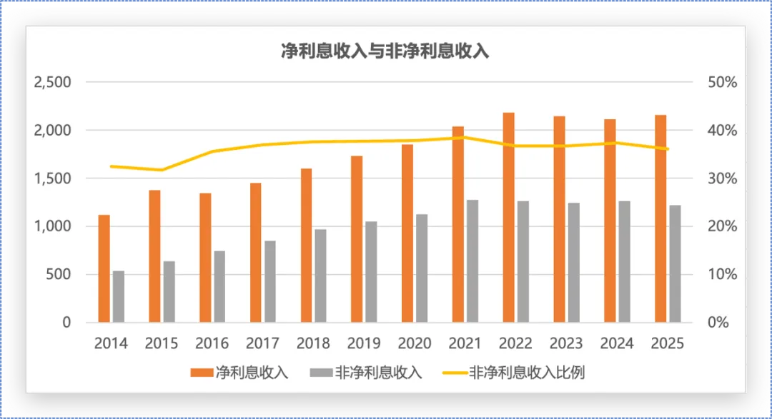 招行营收包括净利息收入和非净利息收入,2014年至今的数据如下图