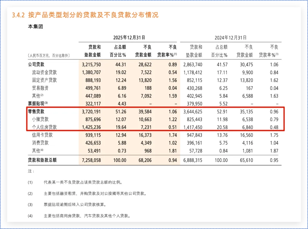 零售贷款不良额和不良率双升,本集团零售贷款余额37,201.91亿元,较上年末增长2.07%,零售贷款占比51.26%。本集团零售不良贷款余额395.84亿元,较上年末增加44.49亿元;不良贷款率1.06%,较上年末上升0.10个百分点,主要是小微贷款和个人住房贷款不良率上升所致???,说明小微贷款和个人住房贷款的风险依然在释放过程。