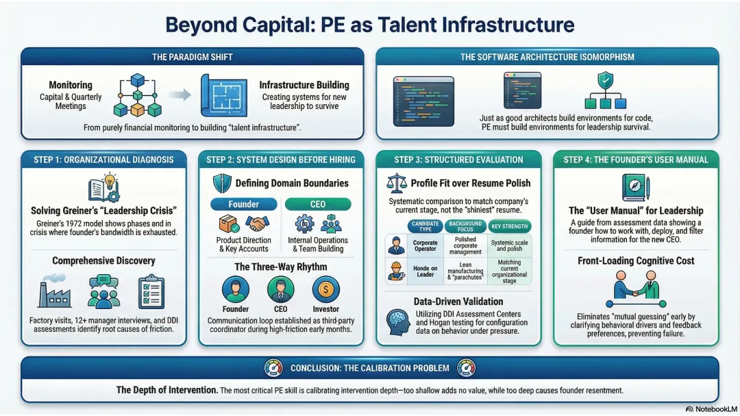 Jim Collins在Good to Great里说first who then what——先找对人再定方向。但他没怎么展开的是:找对人之后,怎么让这个人活下来。PE能提供的不只是capital,是一整套talent infrastructure——从诊断、到选人、到评估、到onboarding机制设计、到持续三方协调。这些东西创始人自己搭不了,不是因为能力不够,是因为他在局中。你没法同时是需要被诊断的对象和设计诊断方案的人