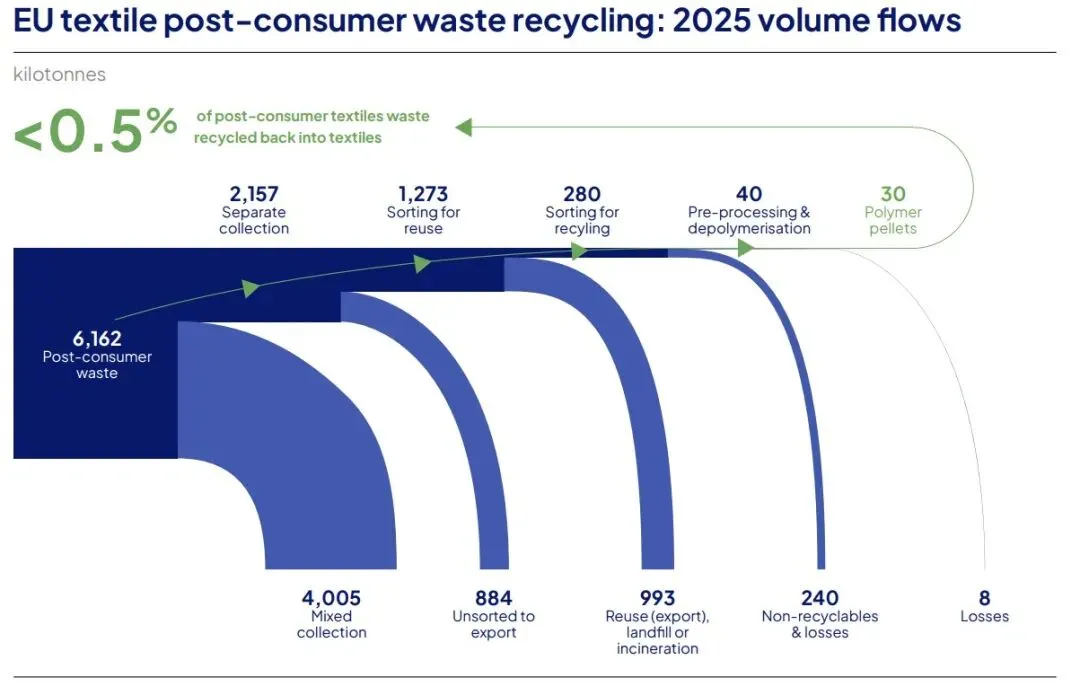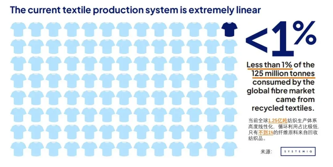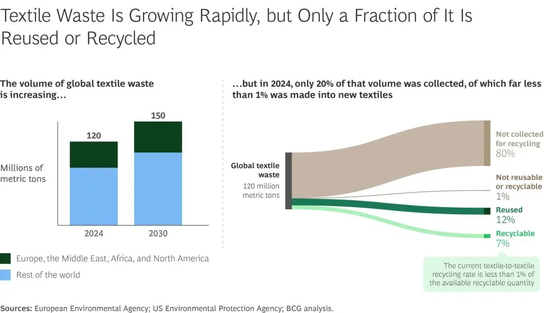 全球废旧纺织品回收体系效率极低,2024年仅20%的废弃物被回收,其中12%仅实现基础再利用,不足1%达成“纺织到纺织”的高值循环,剩余80%最终进入填埋或焚烧环节,循环经济转型迫在眉睫。