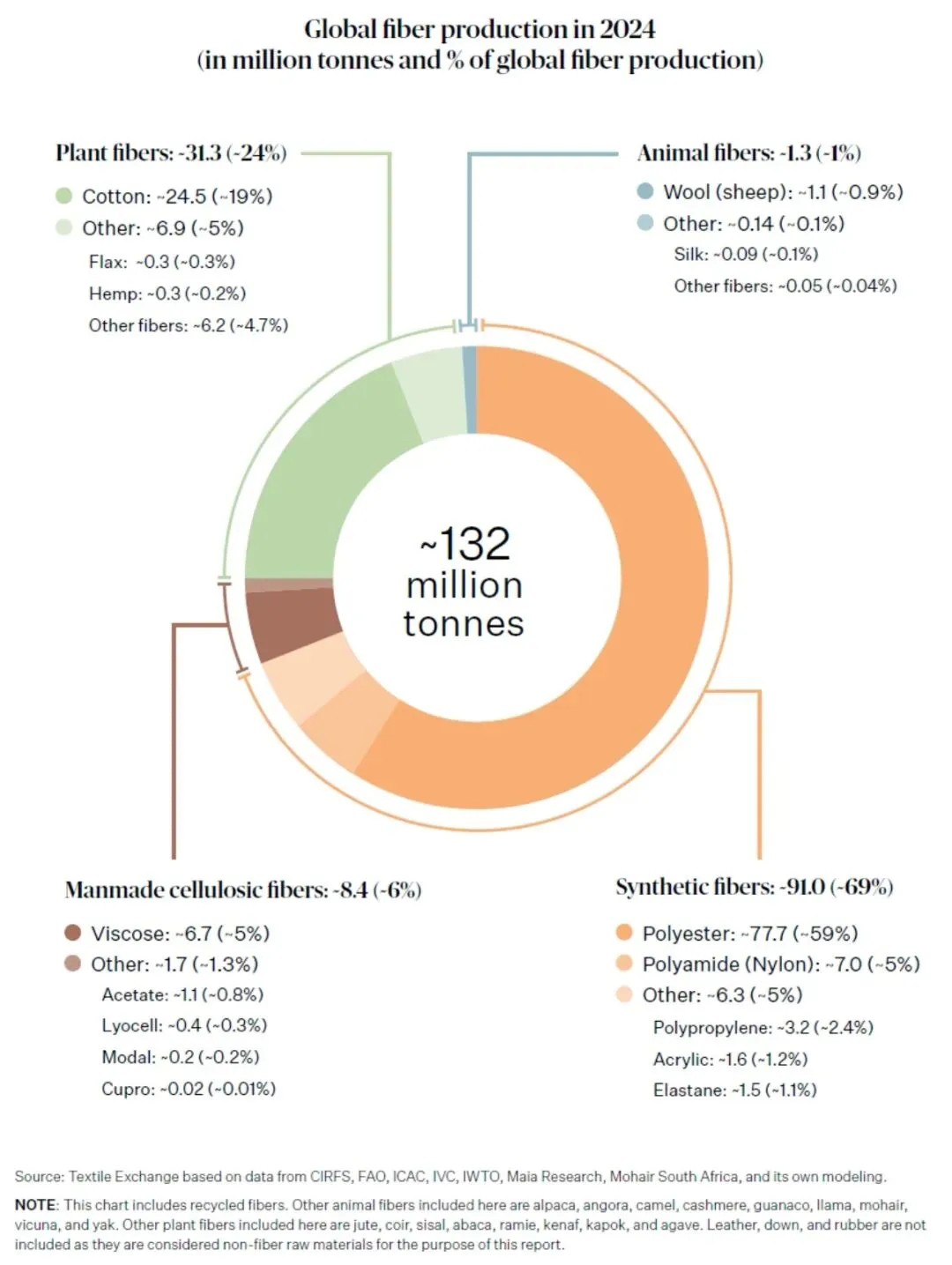 2024年全球纤维总产量达1.32亿吨(Textile Exchange《2025年材料市场年报》),较2023年增长6.5%,较2000年已实现翻倍。按此增速测算,2030年总量将攀升至1.69亿吨;人均纤维消费量也从1975年的8.3kg大幅提升至2024年的16.2kg,行业规模持续扩张。