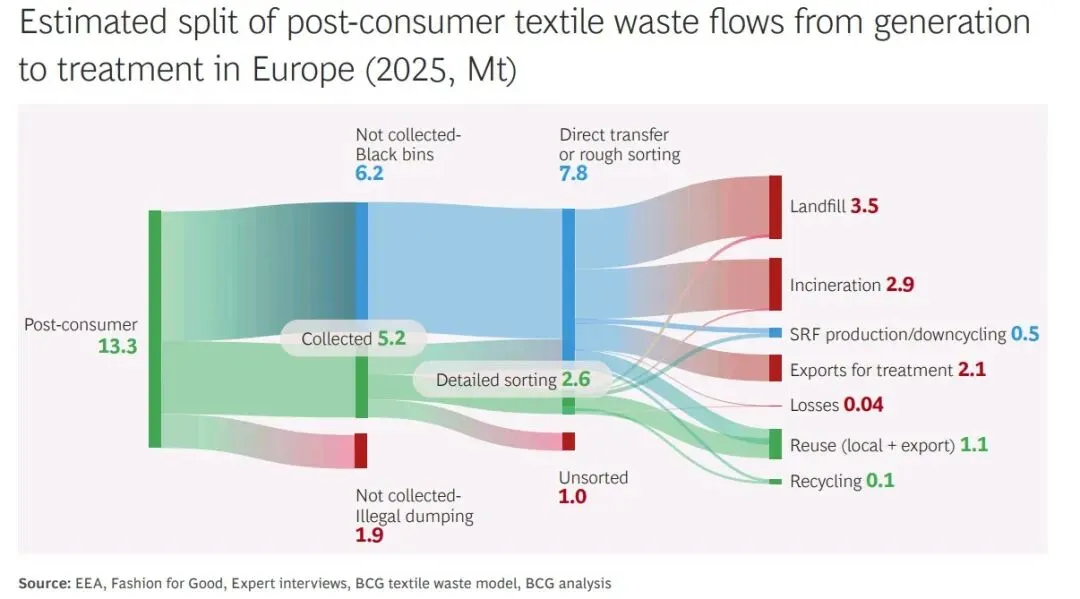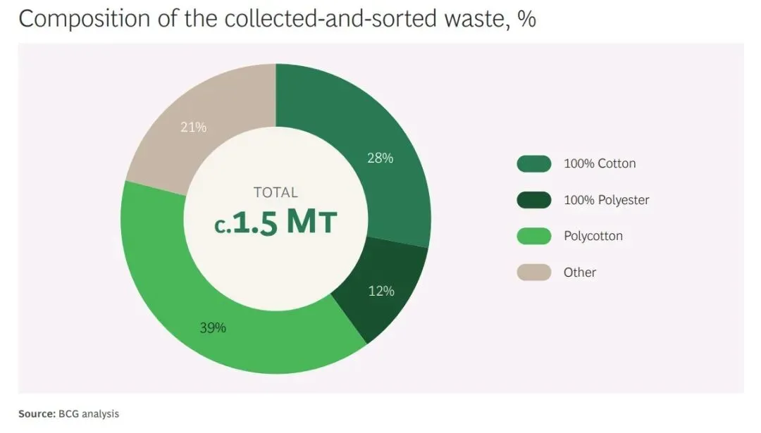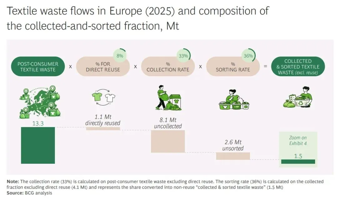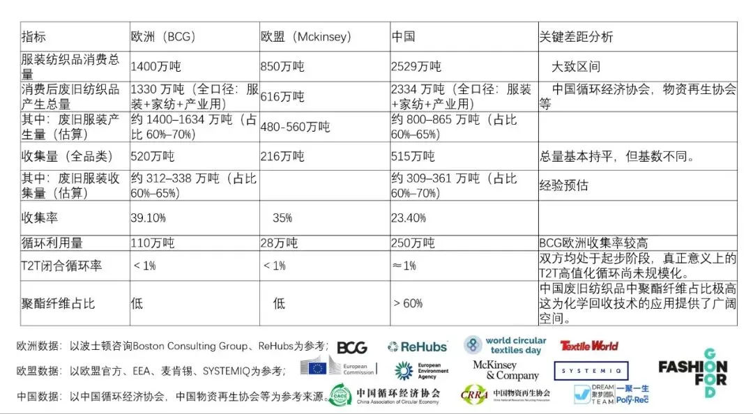 - BCG报告中欧洲消费后废旧纺织品1330万吨,与上述1400万吨服装家纺消费量高度匹配,口径一致、数据合理。