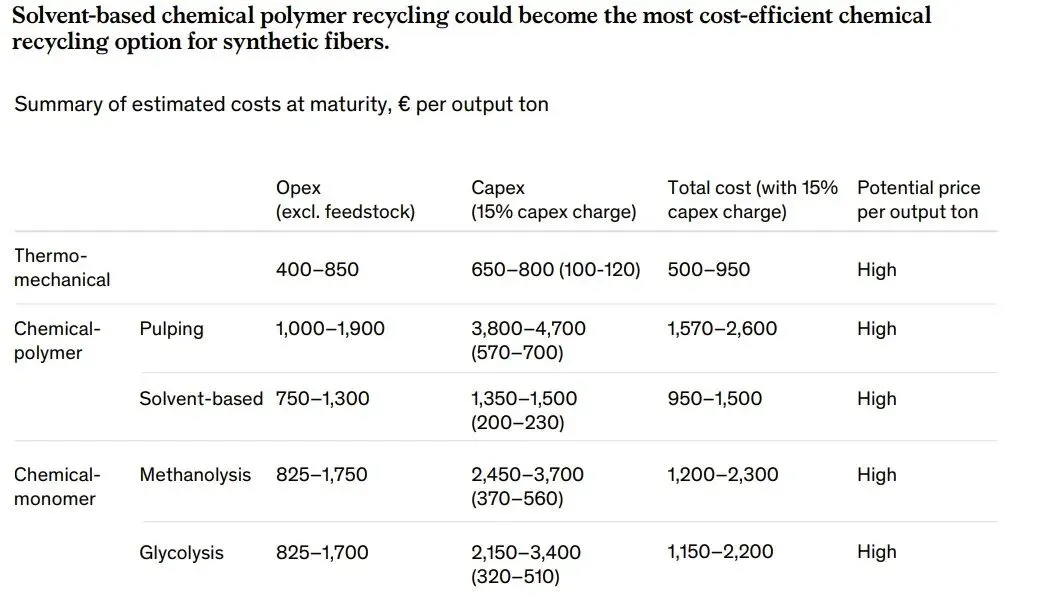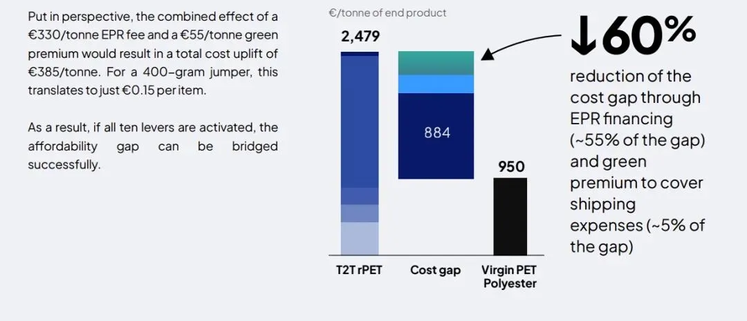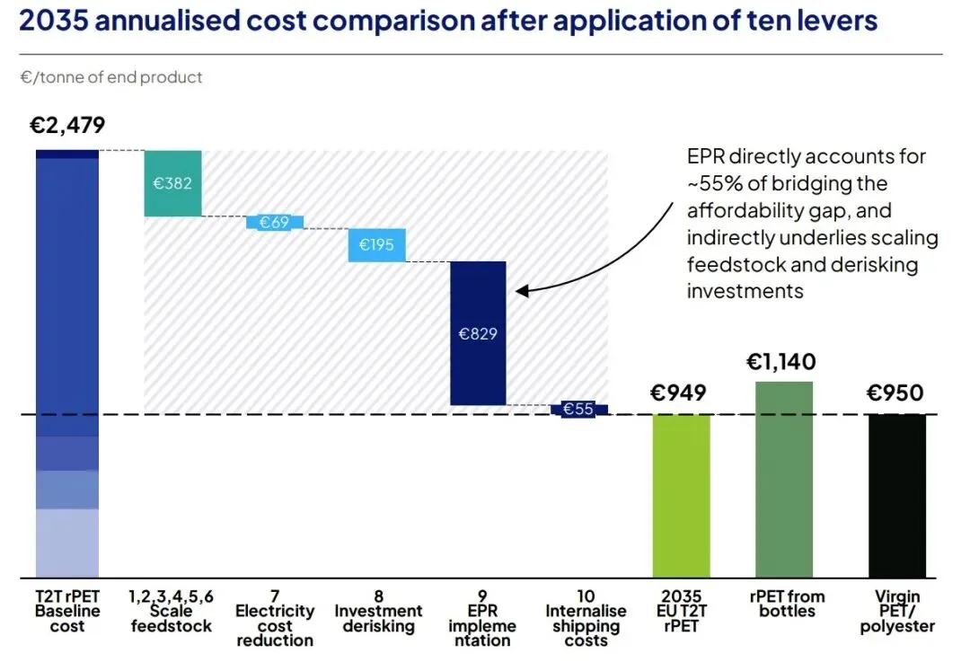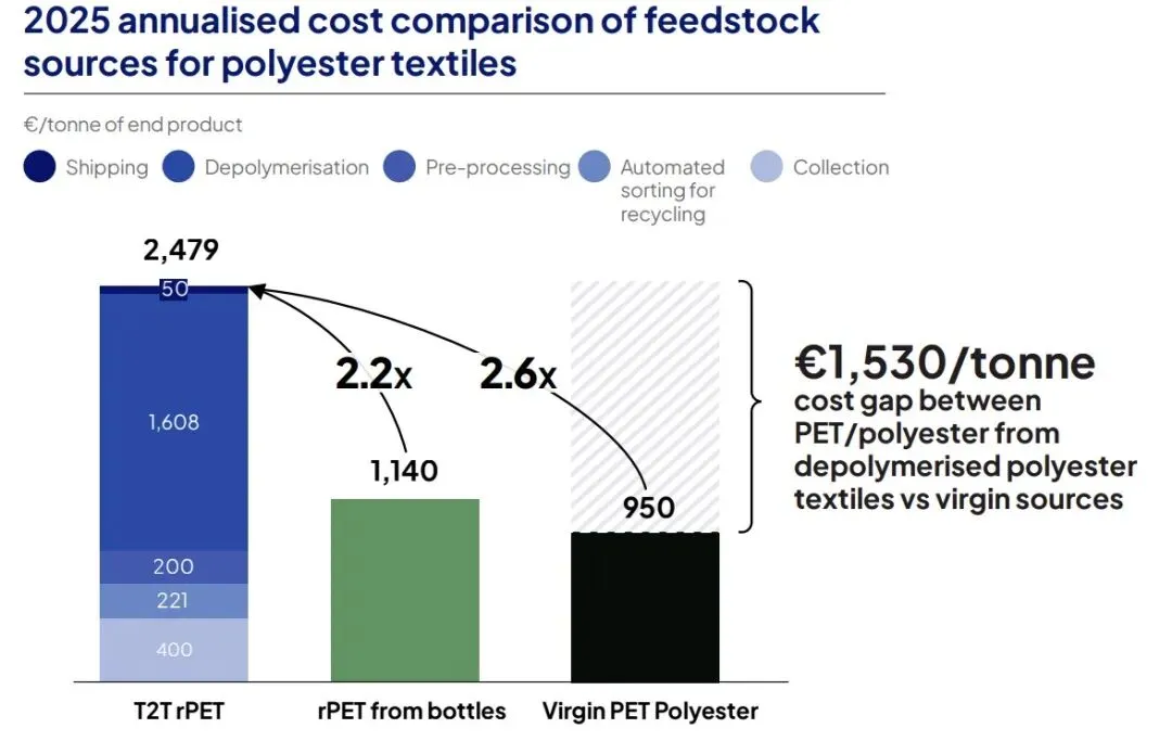 1. 成本鸿沟巨大:目前欧盟T2T rPET(纺织品化学回收再生聚酯)基准成本高达€2,479/吨,而原生聚酯(Virgin PET/polyester)仅为€950/吨,价差约€1,530/吨(约2.6倍);即便是瓶级rPET(rPET from bottles)价格€1,140/吨,T2T也是其2.2倍。