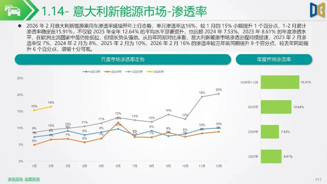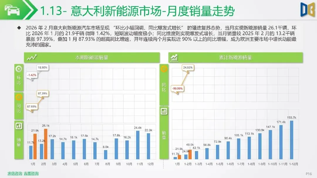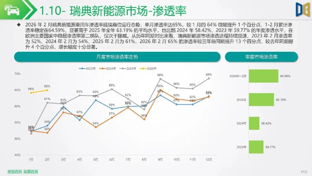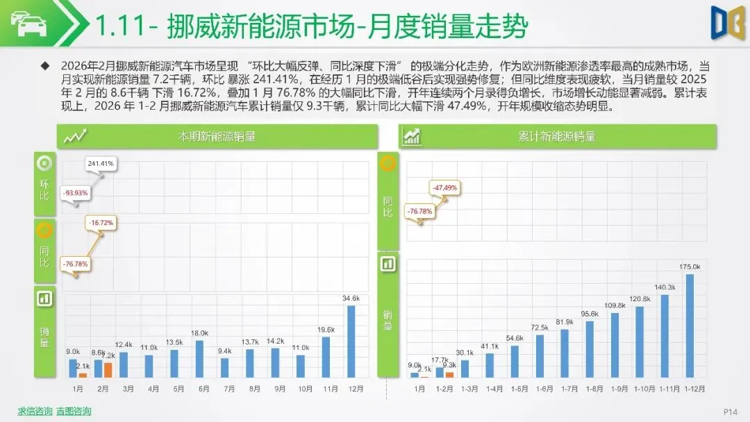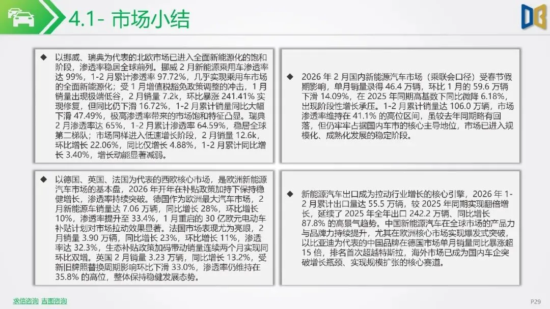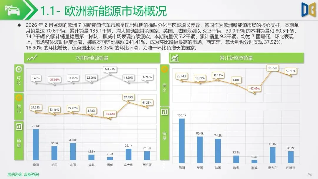 报告聚焦2026年2月新能源车市场动态,指出欧洲市场呈现梯队分化,德国、英国、法国作为核心市场,渗透率持续攀升,德国达33%,法国与英国也分别稳定在32%与36%左右。北欧的挪威与瑞典新能源化程度高,挪威2月渗透率高达99%。相比之下,南欧的意大利与西班牙渗透率较低,但增长势头强劲。