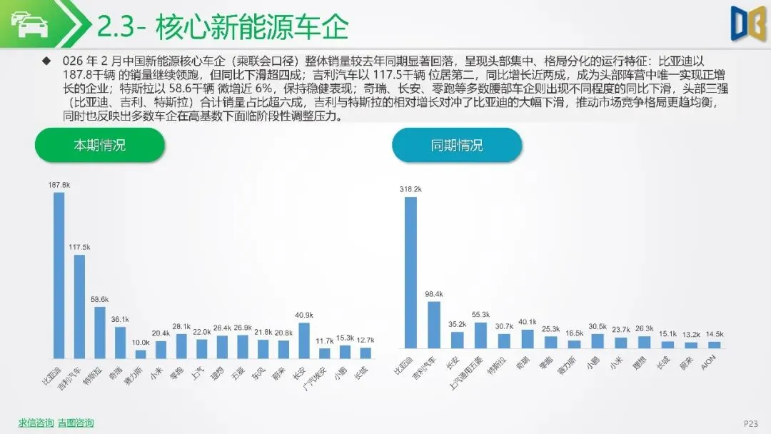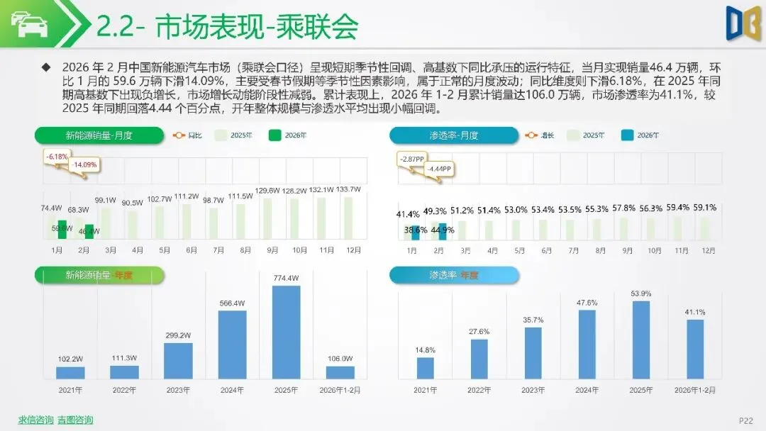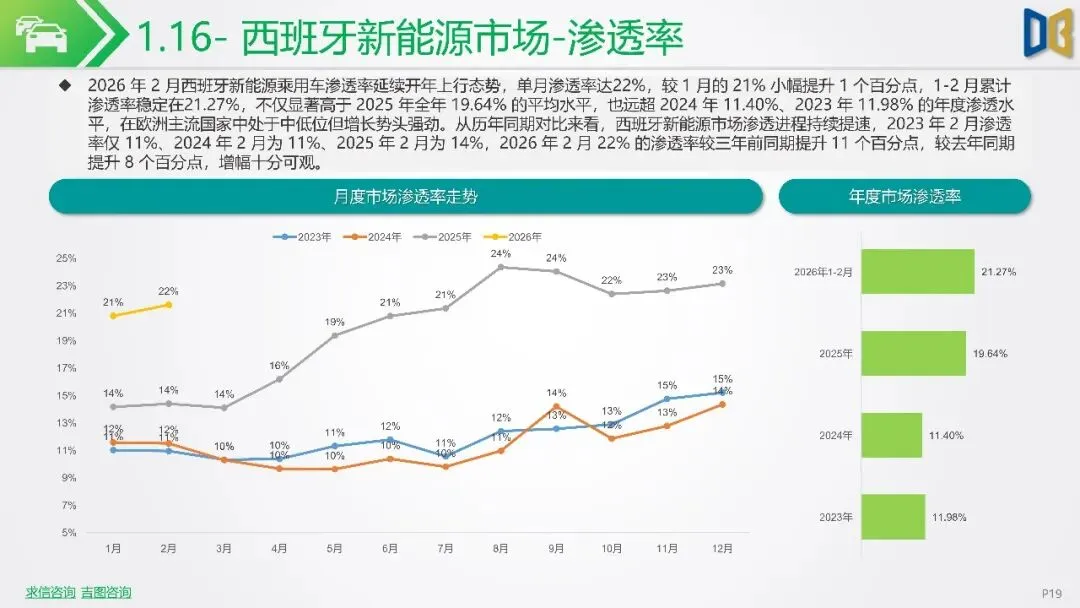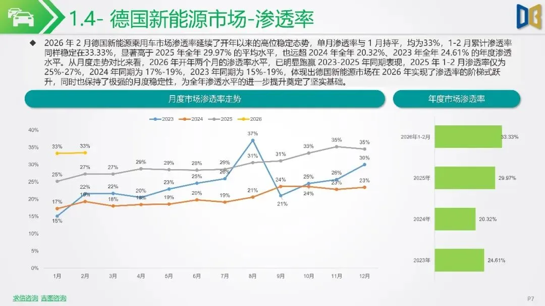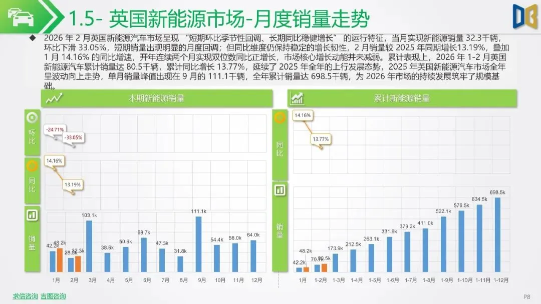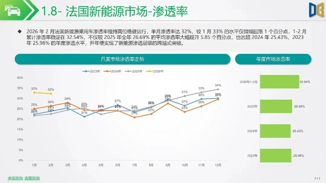 报告聚焦2026年2月新能源车市场动态,指出欧洲市场呈现梯队分化,德国、英国、法国作为核心市场,渗透率持续攀升,德国达33%,法国与英国也分别稳定在32%与36%左右。北欧的挪威与瑞典新能源化程度高,挪威2月渗透率高达99%。相比之下,南欧的意大利与西班牙渗透率较低,但增长势头强劲。