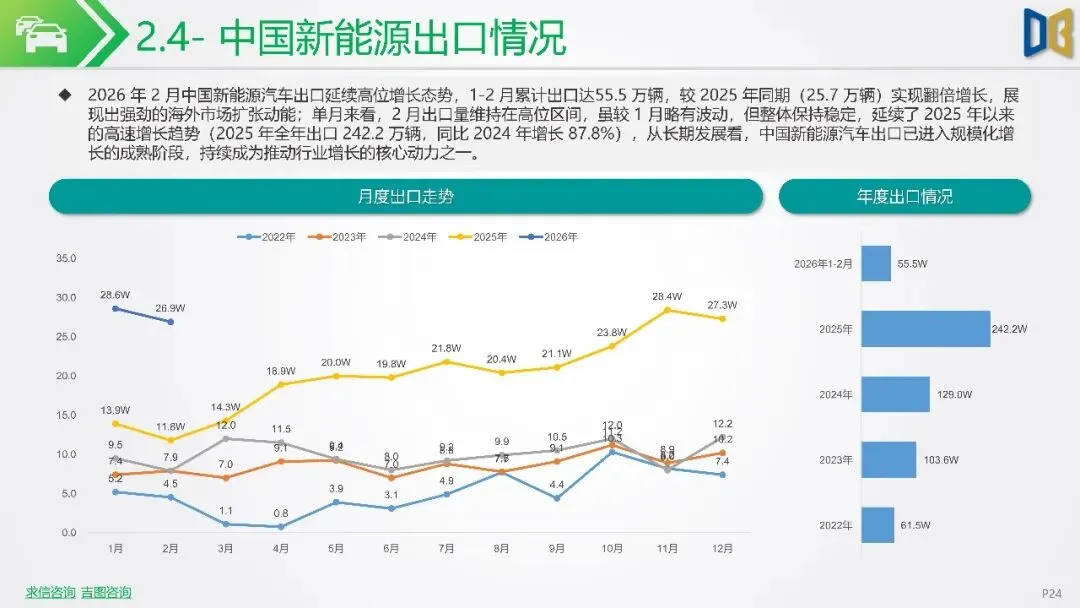 国内市场方面,中国新能源车1-2月累计销量达171万辆,渗透率提升至41%,显示出稳健增长态势,尽管2月单月受春节影响有所回调。出口方面,中国新能源车延续高增长,1-2月累计出口55.5万辆,同比翻倍,成为行业增长核心引擎。充电桩基础设施方面,国内充电桩保有量持续扩大,私人充电桩成为主导,为新能源汽车产业发展提供坚实支撑。