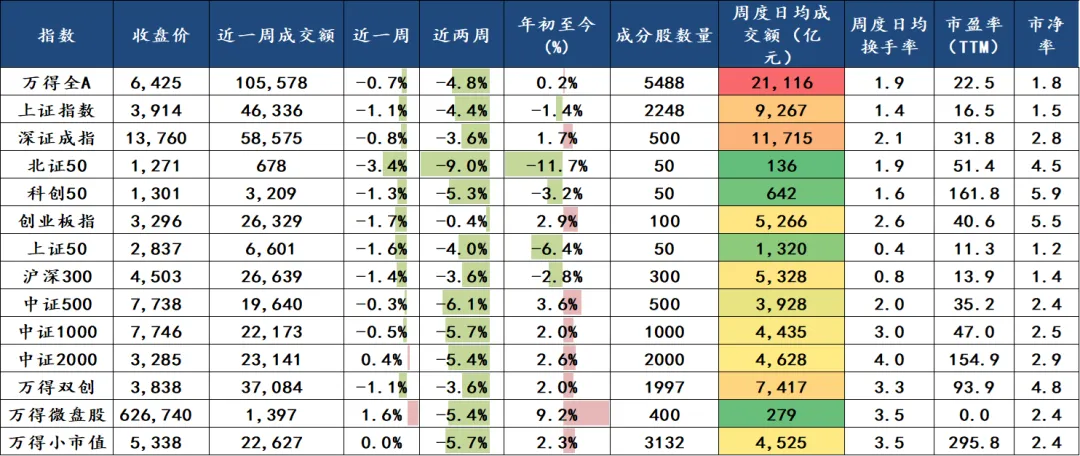 上周宽基指数整体下跌,表现前三名分别是万得微盘股(1.6%)、中证2000(0.4%)、万得小市值(0.0%),表现后三名分别是北证50(-3.4%)、创业板指(-1.7%)、上证50(-1.6%)。