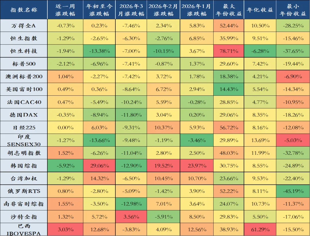上周全球股指涨跌不一,表现前三名分别是巴西IBOVESPA(3.03%)、南非富时综指(1.55%)、胡志明指数(1.52%),表现后三名分别是韩国综指(-5.92%)、标普500(-2.12%)、恒生科技(-1.94%)。