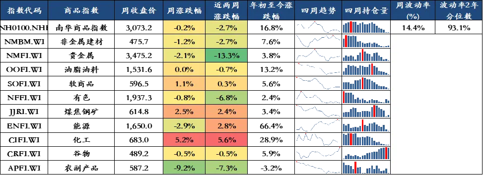 上周商品市场整体下跌,表现前三名商品指数分别是化工(5.2%)、煤焦钢矿(2.5%)、软商品(1.1%),表现后三名商品指数分别是农副产品(-9.2%)、能源(-2.9%)、贵金属(-2.1%)。