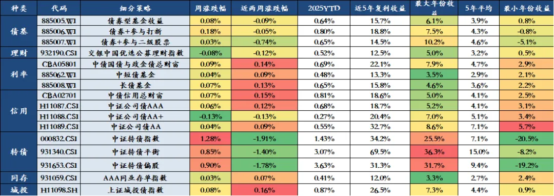 上周债券市场整体上涨,表现前三名分别是中证转债指数(1.28%)、中证转债偏股(0.90%)、中证转债平衡(0.85%),表现后三名分别是中证公司债AA+(-0.13%)、中交银中国优选公募理财指数(-0.08%)、债券+参与二级股票(0.03%)。