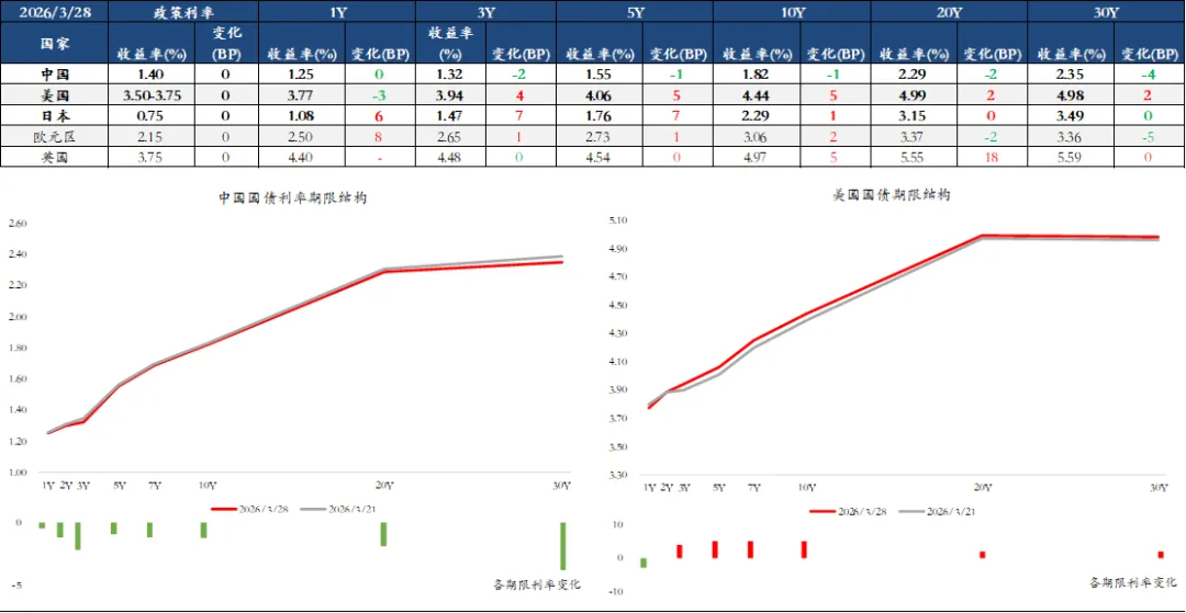 上周,中债收益率窄幅波动,各期限收益率下行0-4bps;美债方面,收益率多数上行,10 年期品种上行约 5bps。