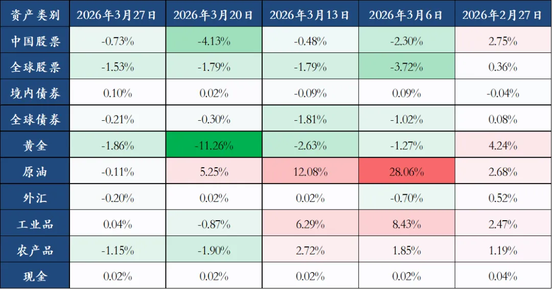 上周全球大类资产整体下跌,表现前三名分别是境内债券(0.10%)、工业品(0.04%)、现金(0.02%),表现后三名分别是黄金(-1.86%)、全球股票(-1.53%)、农产品(-1.15%)