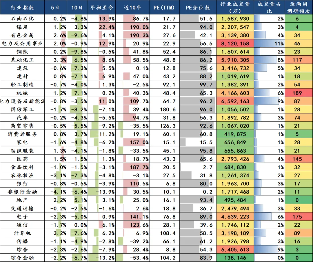 上周【涨跌幅排名】前五的中信一级行业依次为基础化工(3.31%)、有色金属(2.60%)、电力及公用事业(2.01%)、医药(1.49%)、纺织服装(1.32%),后五的行业依次为非银行金融(-4.07%)、计算机(-3.22%)、农林牧渔(-3.11%)、电子(-2.35%)、综合(-2.26%)。