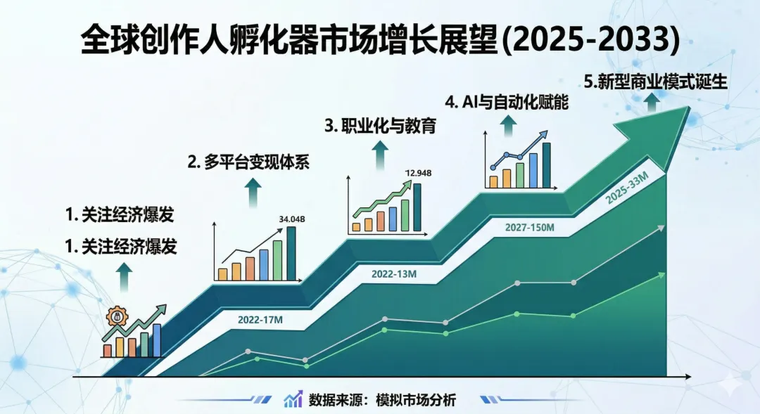 随着创作者经济的爆发,涌现出了一批专注于内容创作者和媒体创业者的特种孵化器。2025年的市场规模预计将达到2523亿美元,这一庞大的群体绝大多数都是一人公司。