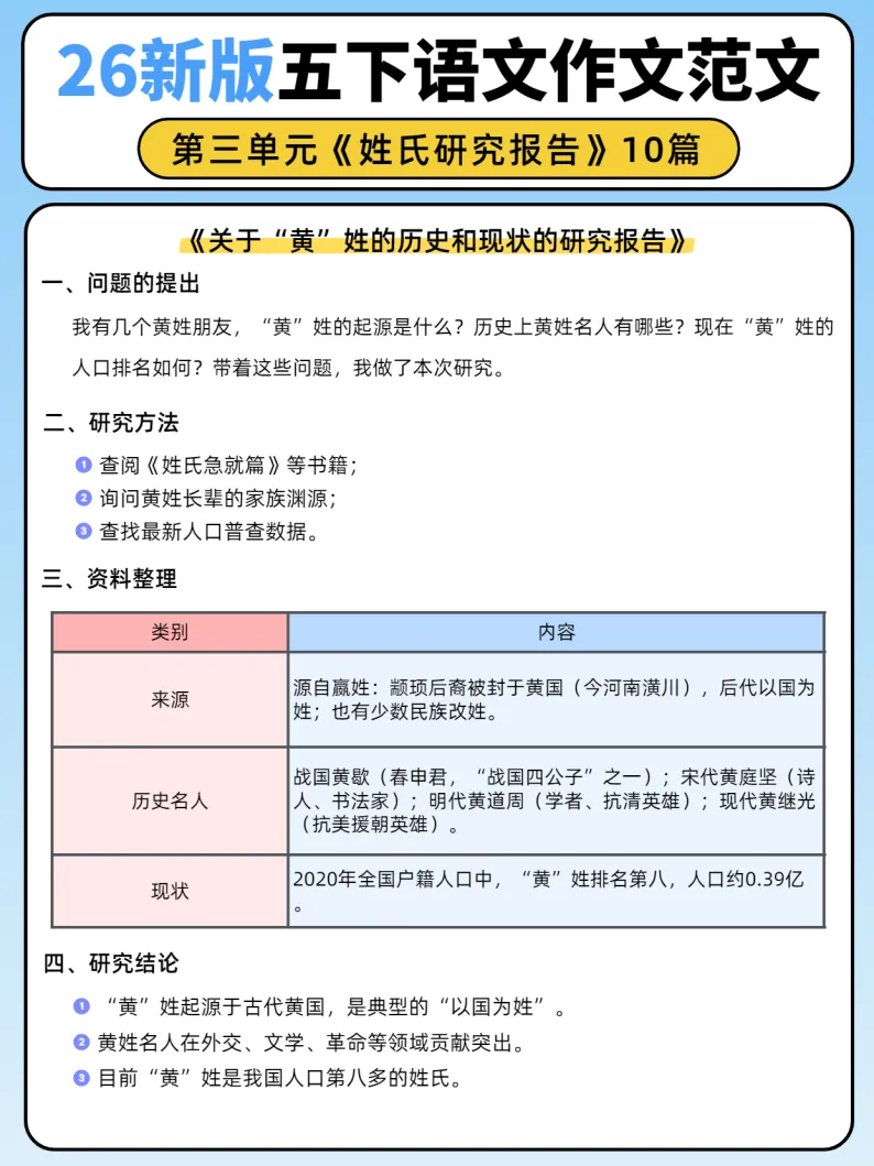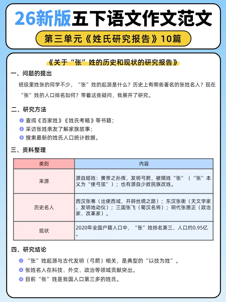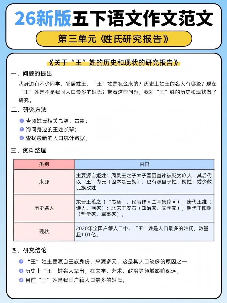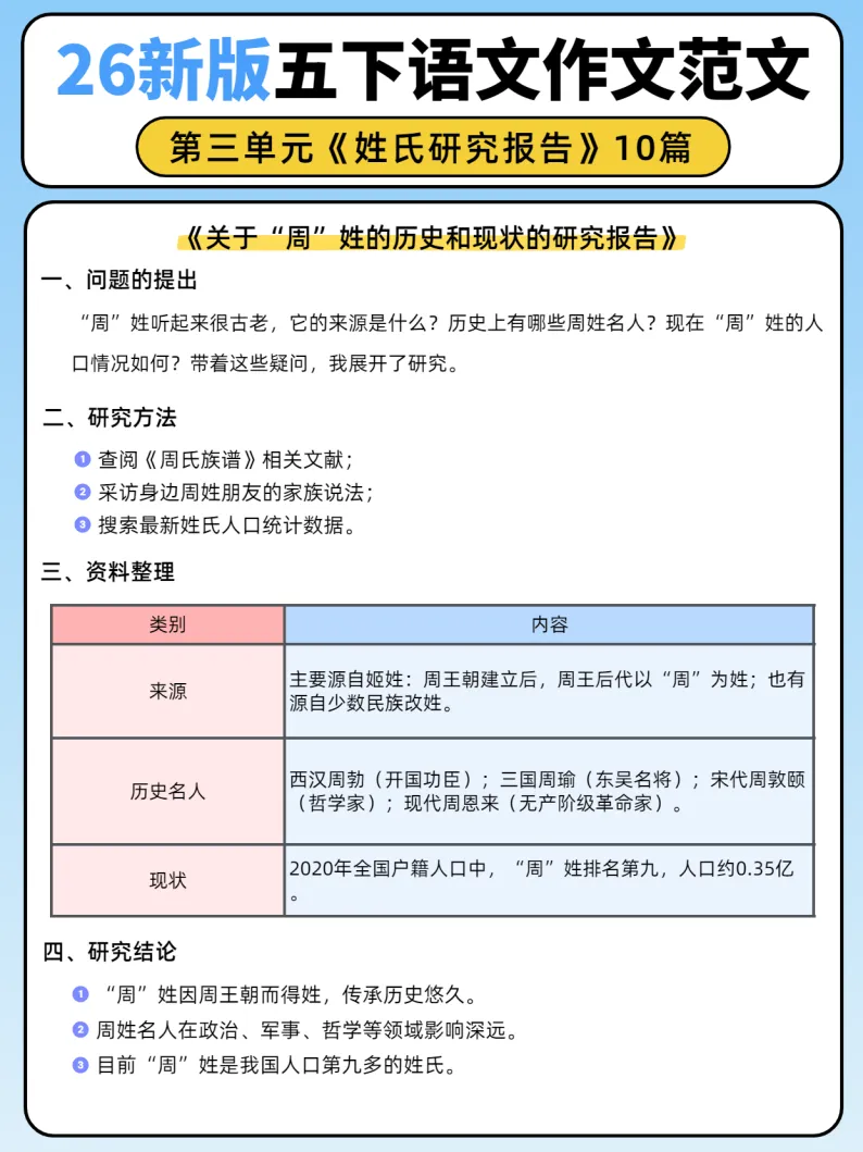 26新版五年级下册语文第三单元《姓氏研究报告》作文范文10篇