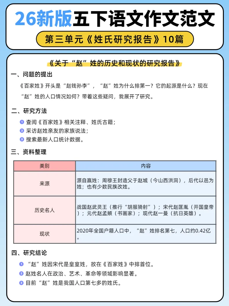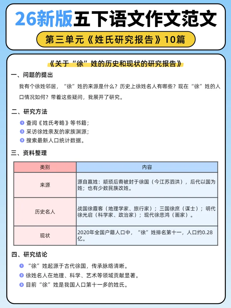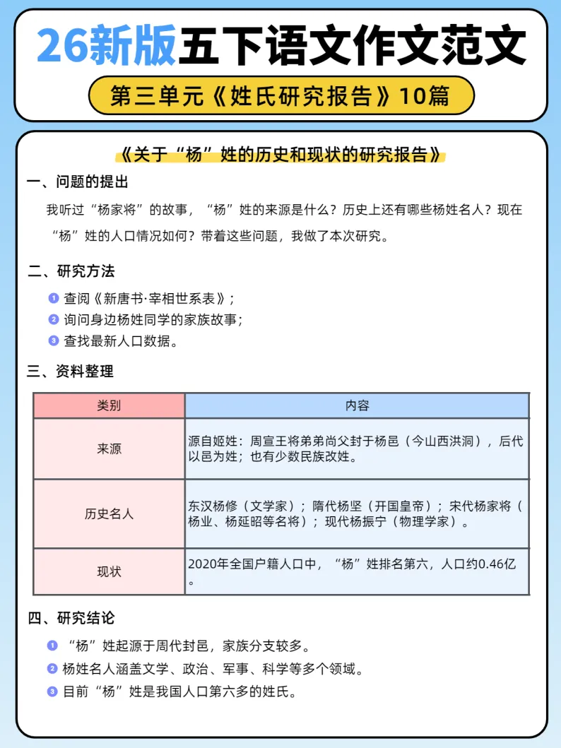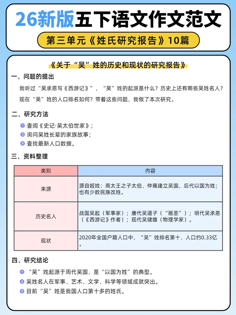 26新版五年级下册语文第三单元《姓氏研究报告》作文范文10篇