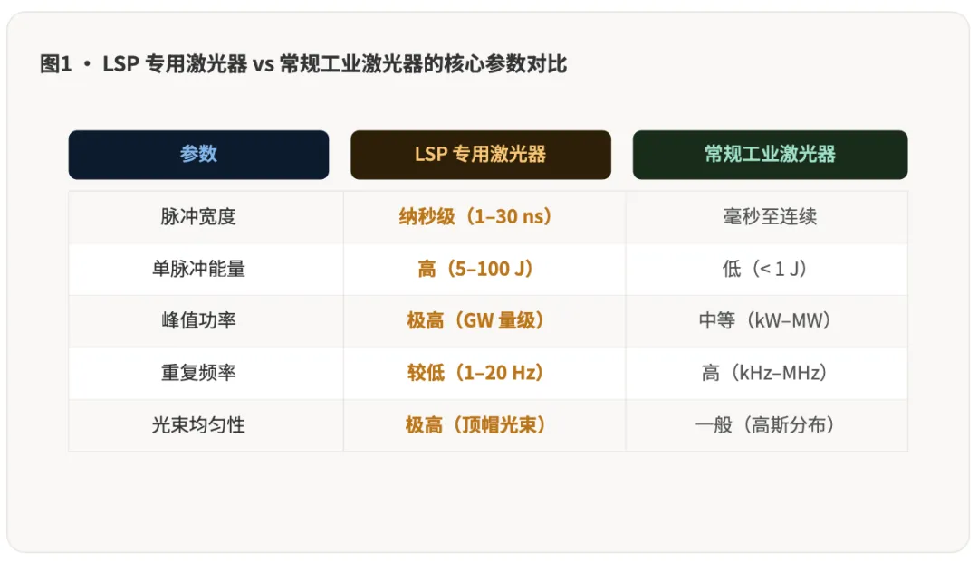这决定了 LSP 对激光器的要求,与常见的切割、焊接激光器有本质区别: