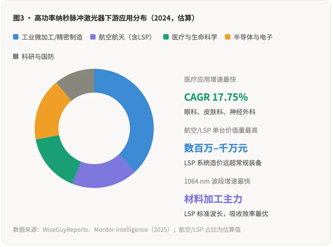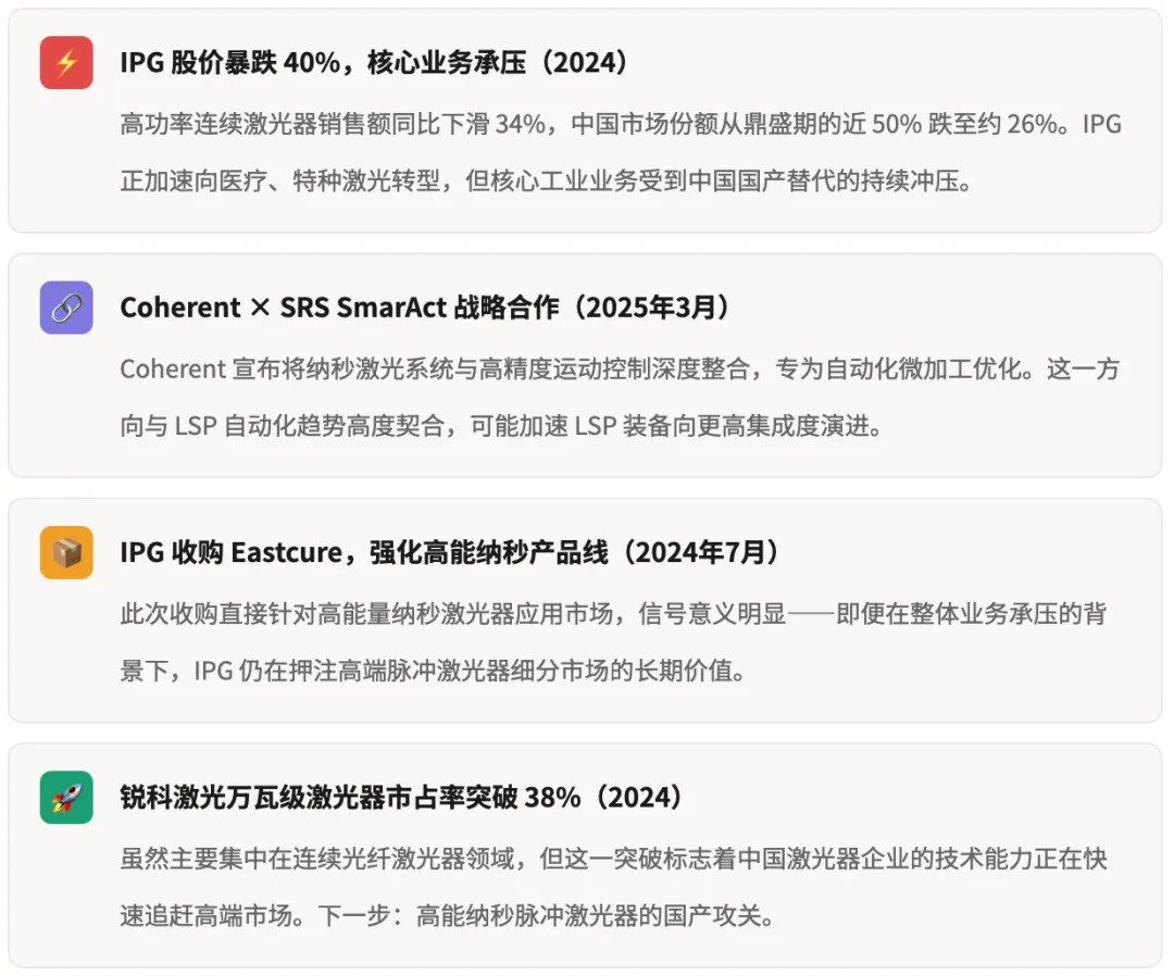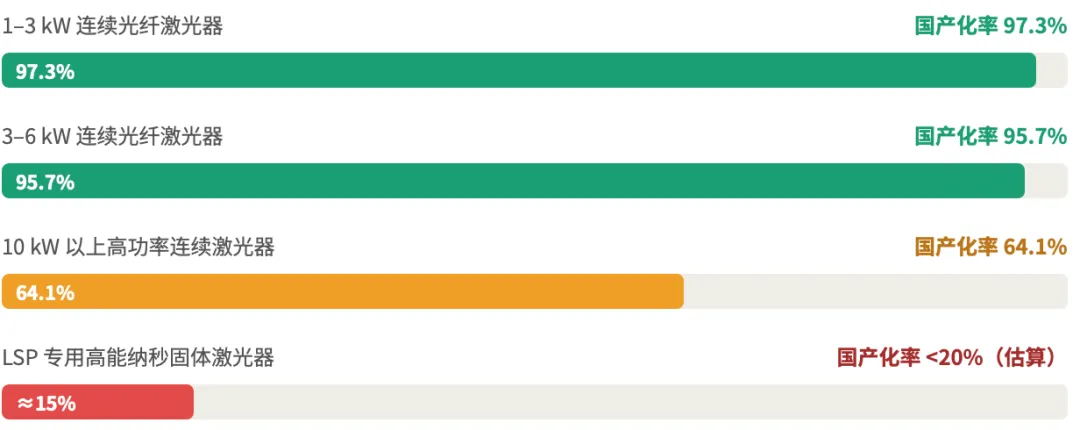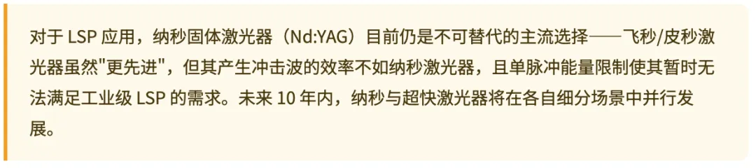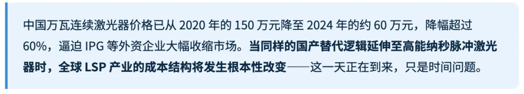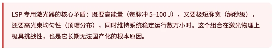 以上数据揭示了中国激光产业的一个结构性矛盾:通用工业激光器已经完成国产替代,但 LSP 专用的高能纳秒激光器恰恰是国产化程度最低的细分市场之一——因为它对单脉冲能量、光束均匀性和系统稳定性的要求远超通用工业激光器。