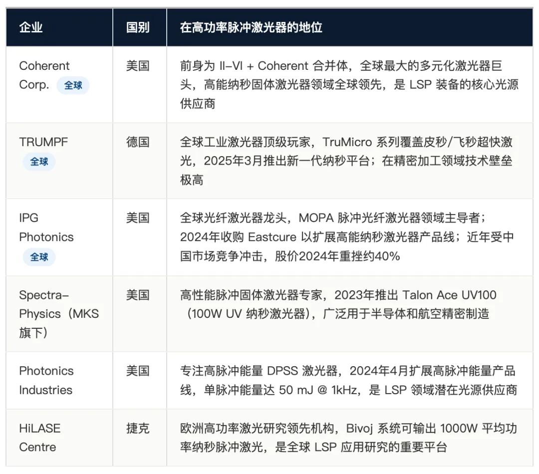 从 LSP 视角来看,最直接相关的是高能纳秒脉冲激光器这一细分市场(单脉冲能量 5J 以上,脉宽 1–30 ns)。目前全球能生产此类激光器的企业屈指可数,这也是 LSP 技术长期被少数国家垄断的直接原因。