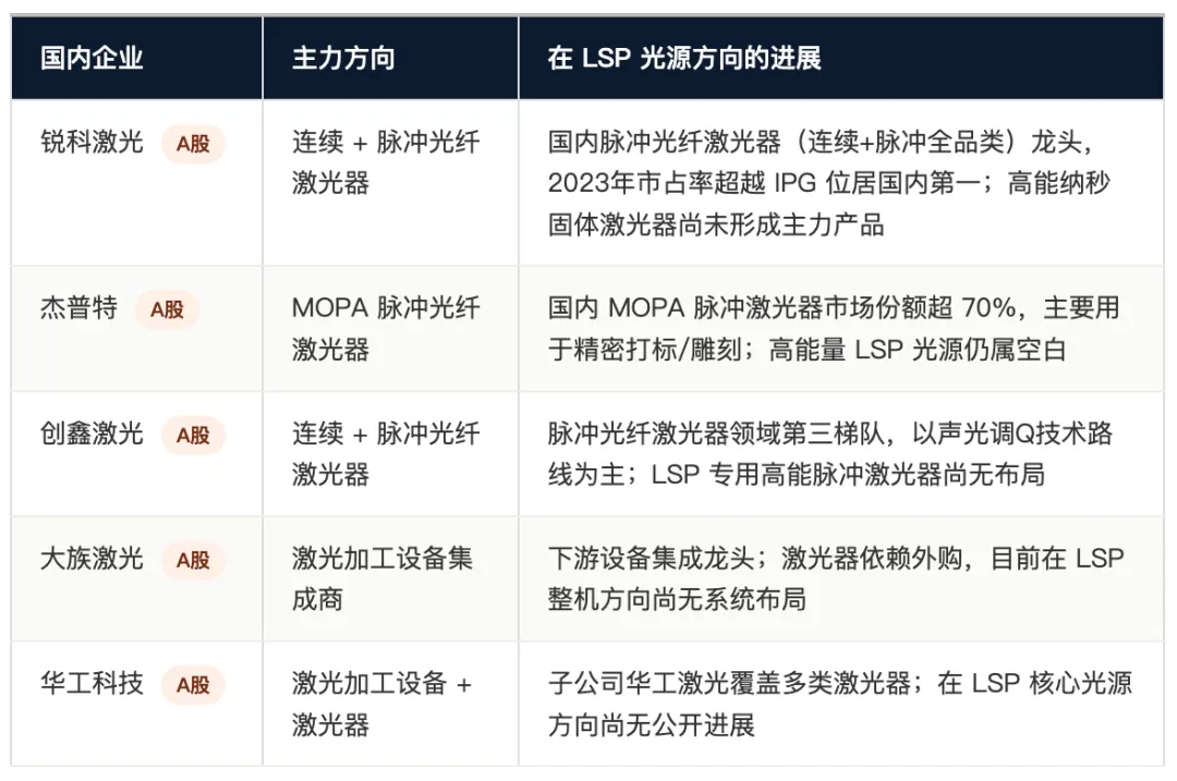 从突破路径看,国内有三条可能的进入路线:一是传统固体激光器厂商(如部分军工单位)向工业化 LSP 光源转化;二是光纤激光器龙头(锐科、杰普特等)通过技术扩展进入高能脉冲赛道;三是高校/科研院所(如中科院激光所、华中科技大学)的技术成果产业化。目前三条路径均在推进,但均未形成工业级产品。