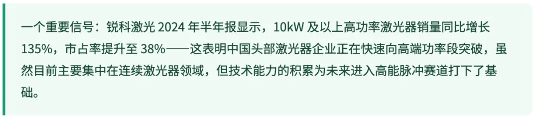 目前这个位置被 Coherent、TRUMPF 等欧美巨头牢牢占据。但在中国激光产业完成中低功率国产替代的历史剧本之后,下一个剧本已经开始书写——而它的核心命题,就是高能脉冲激光器的国产突围。