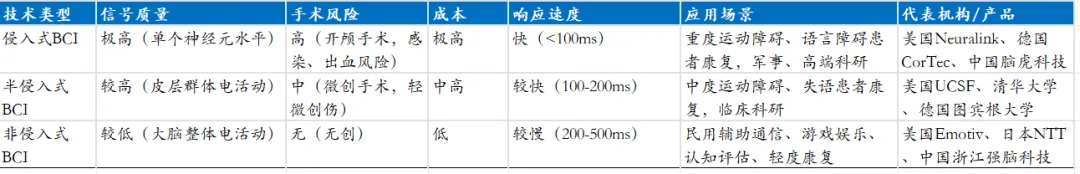1.2.3 非侵入式脑机接口(Non-invasive BCI)非侵入式脑机接口是指无需进行手术,通过佩戴外部传感器(如脑电帽、功能磁共振成像设备等),从头皮表面采集大脑神经电信号或代谢信号,经解析后转化为机器指令的技术。该类技术的核心优势是无创、安全、操作简便、成本较低,能够实现大规模普及,是目前民用领域应用最广泛的脑机接口类型。目前,非侵入式BCI的信号采集方式主要有四种:脑电图(EEG)、功能磁共振成像(fMRI)、近红外光谱(fNIRS)和脑磁图(MEG)。其中,EEG是最常用的方式,具有采集速度快、成本低、便携性强等优点,广泛应用于辅助通信、游戏娱乐、认知评估等领域;fMRI和fNIRS主要用于大脑功能定位和认知研究,能够捕捉大脑代谢活动的空间分布,但设备体积庞大、成本高昂,便携性差;MEG具有极高的时间分辨率和空间分辨率,但设备价格昂贵,难以普及。中文文献中,清华大学高小榕教授团队研发的视觉诱发电位脑机接口系统,通过EEG信号采集,帮助渐冻症患者王甲实现中文输入和诗句朗诵,展现了非侵入式BCI在辅助通信领域的应用价值;日本文献中,NTT通信科学实验室研发的“心智字幕”技术,通过fMRI采集大脑活动信号,结合双重AI模型,将受试者的视觉体验或回忆转化为文字,为语言受损者提供了全新的交流方式;德文文献中,柏林脑机接口研究团队利用EEG信号开发的集体电脑游戏,让523名参与者通过放松或专注的心理状态控制沉浸式艺术环境,验证了非侵入式BCI在非医疗领域的应用潜力。优点:无创、安全,无需手术,无感染、免疫排异等风险;操作简便,用户无需专业培训即可使用;成本较低,设备便携性强,可实现大规模普及;伦理争议小,无需植入设备,不涉及大脑组织损伤和隐私泄露风险。缺点:信号质量较差,受头皮、颅骨、肌肉活动等干扰较大,信号衰减严重;控制精度低,响应速度较慢(通常在200-500ms),难以实现复杂动作的控制;信号稳定性差,不同个体、不同时间的信号差异较大,难以实现个性化适配;无法捕捉单个神经元或皮层局部的电信号,仅能捕捉大脑整体的电活动。脑电图(Electroencephalography, EEG):最广泛使用的非侵入式BCI技术,通过头皮电极记录神经元集群电活动,具有高时间分辨率但空间分辨率受限功能性近红外光谱(fNIRS):检测皮层血氧水平变化功能性磁共振成像(fMRI):高空间分辨率但时间分辨率低美国Emotiv公司的EEG脑电帽,用于游戏娱乐、认知评估等民用领域;日本NTT通信的“心智字幕”系统,用于语言障碍患者的交流辅助;中国浙江强脑科技的非侵入式脑机接口系统,用于渐冻症、自闭症患者的辅助康复;德国比勒菲尔德大学研发的EEG认知评估系统,用于监测人体注意力、疲劳状态等。1.2.4 三类脑机接口技术的对比总结