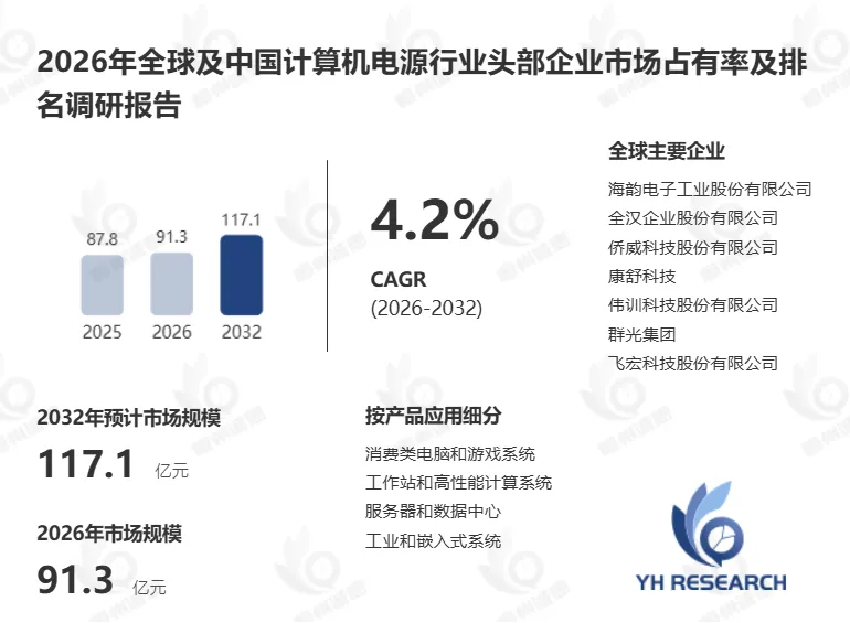 根据YH恒州诚思信息咨询调研统计,2025年全球计算机电源市场规模约87.78亿元,预计未来将持续保持平稳增长的态势,到2032年市场规模将接近117.1亿元,未来六年CAGR为4.2%。