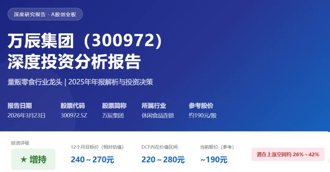 免责声明:本报告基于公开信息(万辰集团2025年年度报告、东方证券/东吴证券研究报告、各大财经媒体报道)撰写,仅供学习研究参考,不构成任何投资建议。股市有风险,投资需谨慎。报告中的财务数据以公司官方年报披露为准,预测数据仅为分析假设,不代表未来实际情况。报告日期:2026年3月23日。