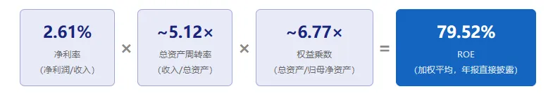 注:上述三项乘积(2.61%×5.12×6.77≈90.5%)与加权平均ROE(79.52%)存在差异,原因在于加权平均ROE基于加权平均净资产计算(净资产年内增速约35%,加权均值更高),以年报披露的79.52%为准。