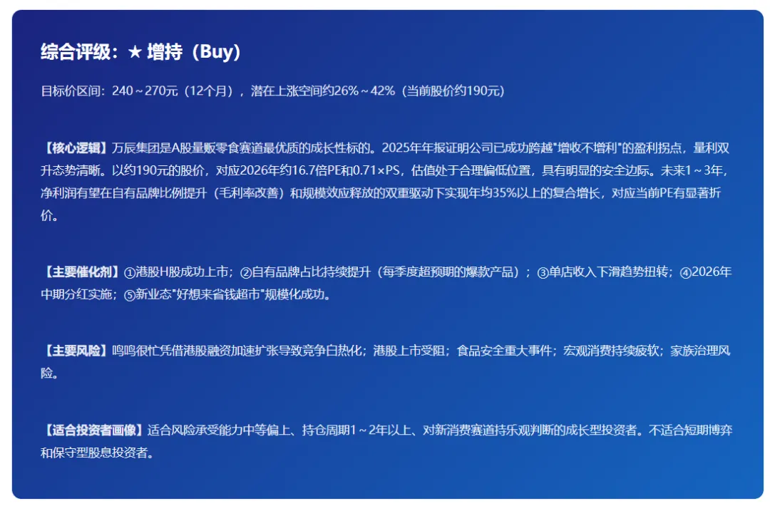 综合评价:万辰集团的高ROE是"高周转+高杠杆"驱动的,净利率提升空间巨大(自有品牌规模化后预计可达5%~8%),商业模式本质上是优质的。需警惕高财务杠杆在宏观环境变化时对ROE的反向侵蚀。