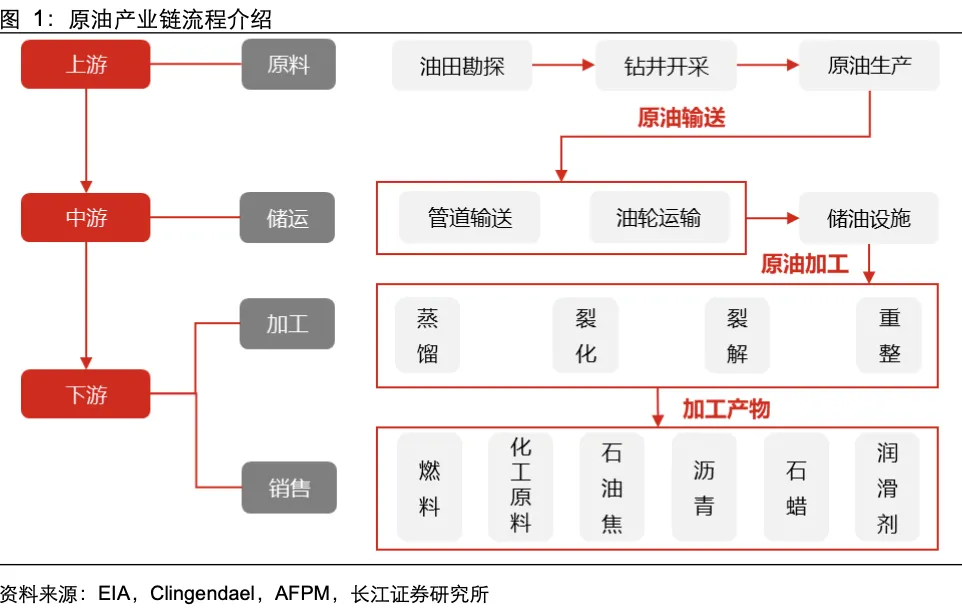 原油产业链具有链条长、结构复杂、下游产品多样的特点。整个产业链完整覆盖了原油勘探、钻井开采、储存运输、加工炼制及产品分销等多个环节。上游环节聚焦地下油气资源的勘探与开采;中游以原油储存和运输为核心,借助管道、船舶等运输方式,将开采出的原油输送至炼油厂或相关储存设施,保障资源流转顺畅;下游环节则以原油加工炼制为主,对原油进行深度处理。