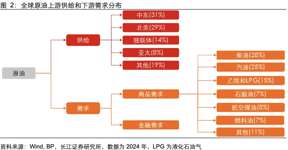 原油供需格局主要由上游开采生产与下游加工共同决定。上游生产端高度集中,主要分布在中东、独联体地区以及北美页岩油产区;下游需求端则以商品消费为主,其中交运行业消耗的汽油、柴油与航空煤油合计占比约六成,是需求的核心构成。