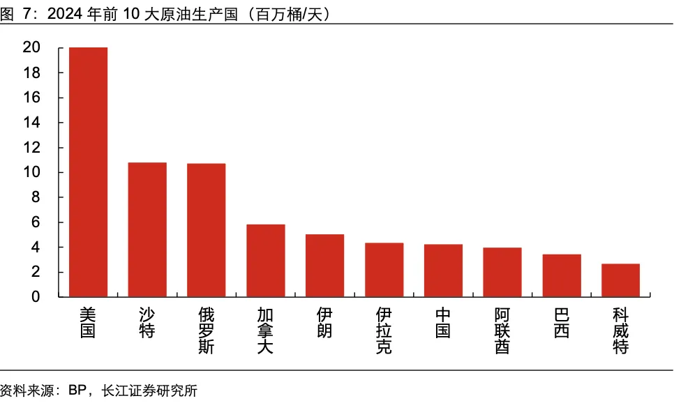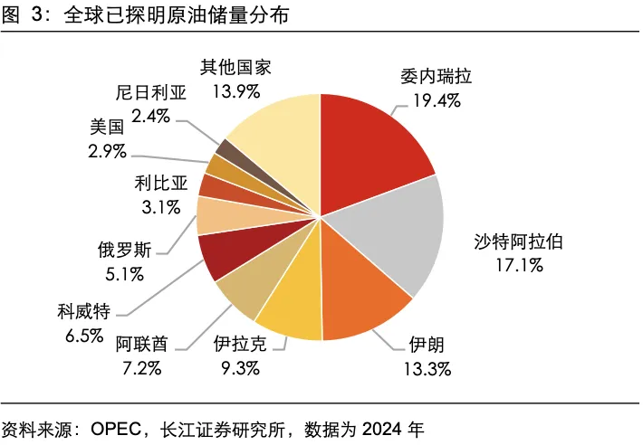 OPEC在原油储量与产量上占据绝对主导,OPEC+贡献了超全球一半的产量。尽管美国凭借页岩油稳居产油国首位,但全球储产量仍高度集中。当前其他国家产能基本释放完毕,截至2025年末,OPEC的剩余产能约占全球总产量的3.6%。