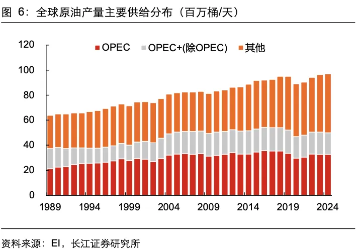 产量层面,原油供给基本由OPEC+主导掌控。长期来看,全球原油产量整体呈上升趋势,增速虽有波动,但大多处于5%增速以下。从产量分布格局来看,OPEC是全球最核心的产油主体,产量占比超过全球总量的三分之一;若将范围扩大至OPEC+,其合计产量占比则超过全球一半。