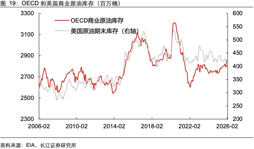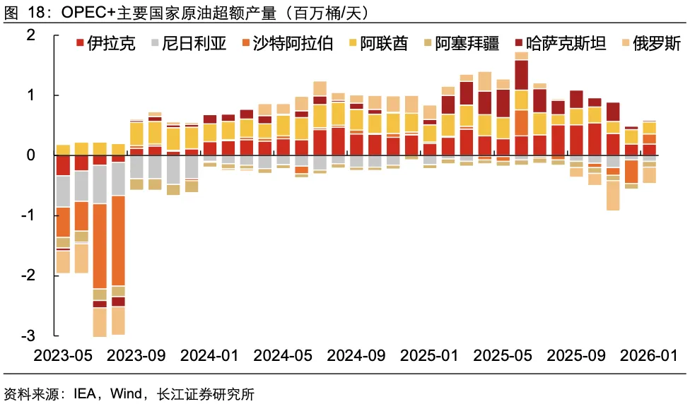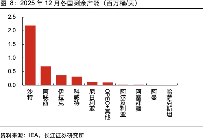 OPEC近期剩余产能不大。截至2025年末,OPEC的剩余产能约占全球总产量的3.6%,而OPEC+内的非OPEC产油国的原油产能已基本释放完毕。短期来看,OPEC目前已转向增产模式,或推动原油供给端整体呈现偏松态势。