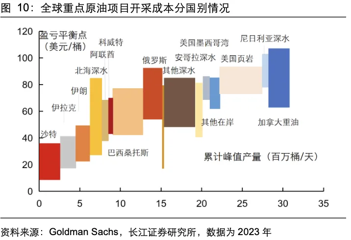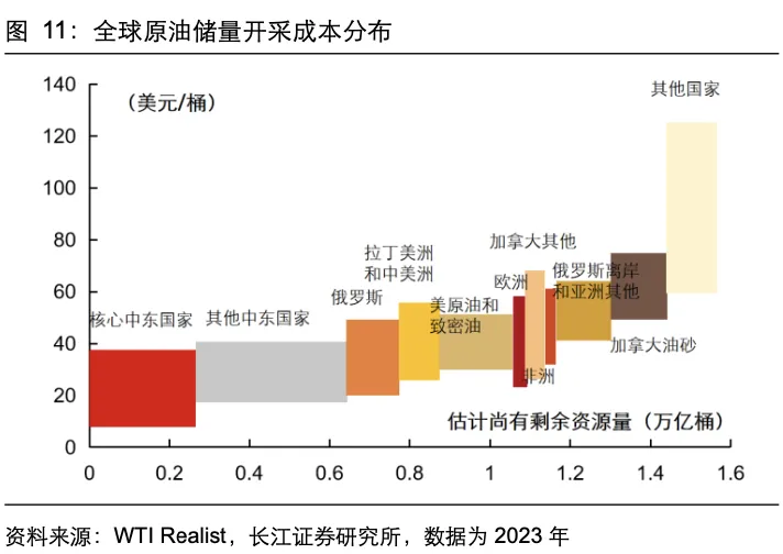 开采成本是决定油价底部区间与边际产能的核心因素。除了OPEC剩余产能这一影响因素外,开采成本的高低直接决定了其他国家原油产能的释放程度。从整体情况来看,当油价处于70-80美元/桶的区间时,基本能够覆盖当前原油产量及储量的成本,这也构成了油价的底部支撑。