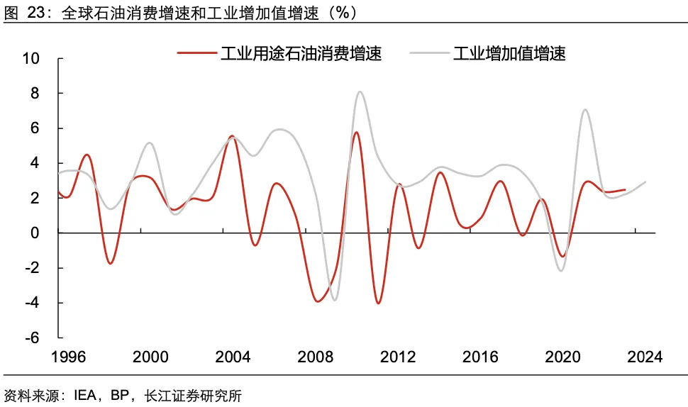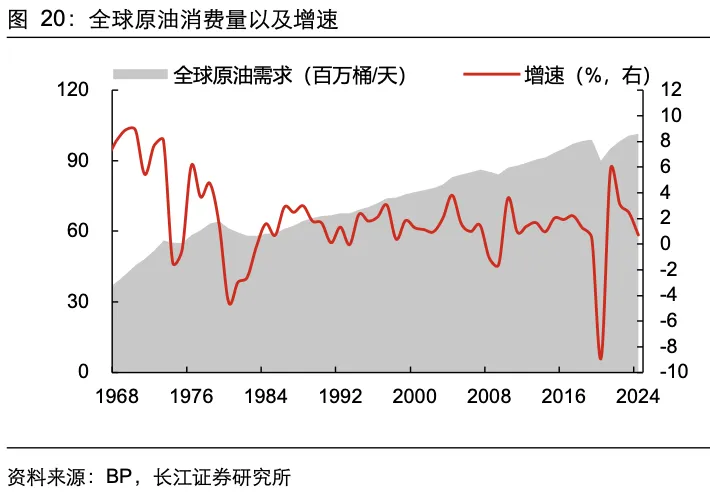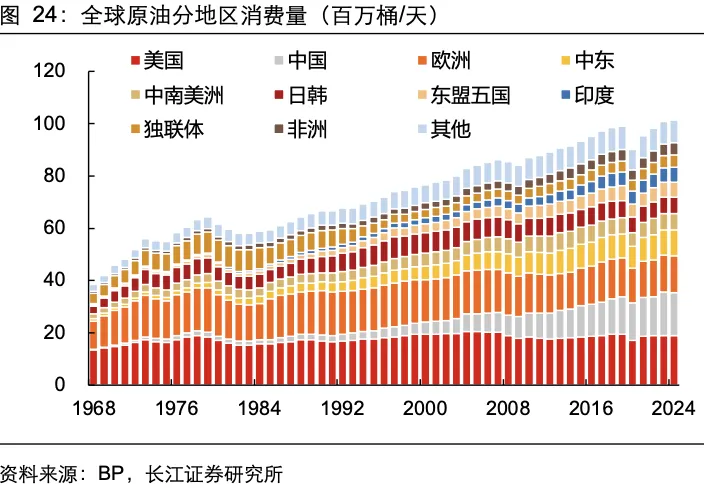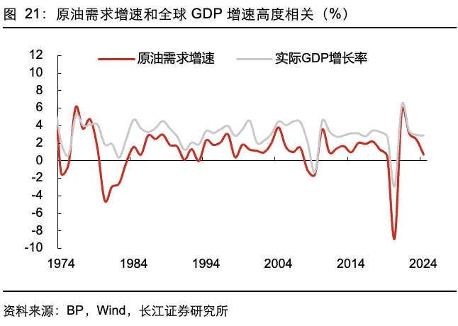 原油需求与GDP增速呈现高度相关性。2024年全球原油需求量约为1亿桶/日,近年来原油消费量保持稳定,与全球经济运行节奏基本同步。尽管全球卫生公共事件期间原油需求曾大幅下滑,但当前需求水平已回升。
