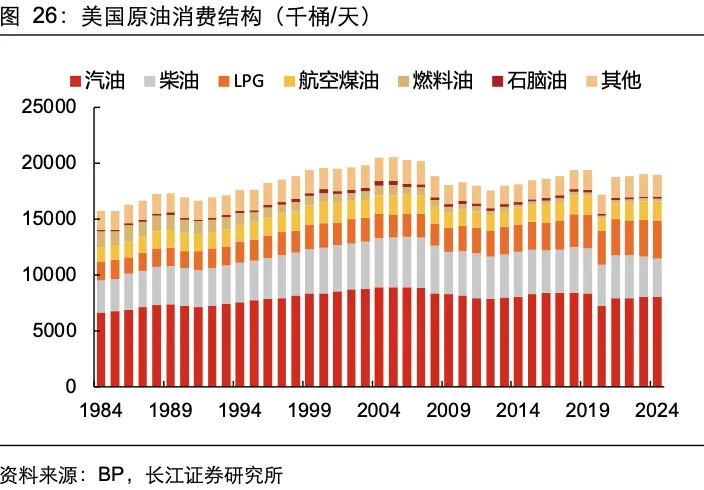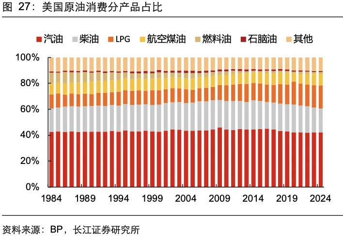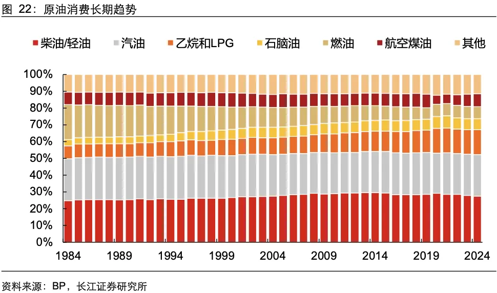 在原油消费结构中,交通运输用油占据主导地位。从主要产品划分,原油加工产品主要包含柴油、汽油、乙烷、液化石油气、石脑油以及航空煤油等。从消费占比变化来看,传统燃油的消费比重明显下降,乙烷与液化石油气的消费占比则持续提升。