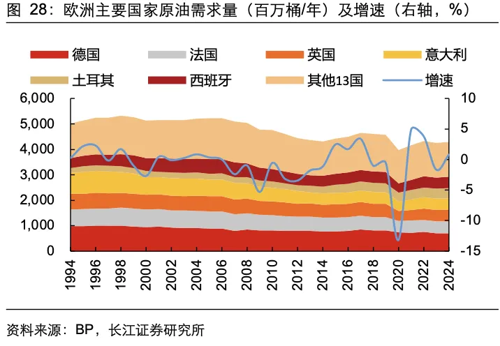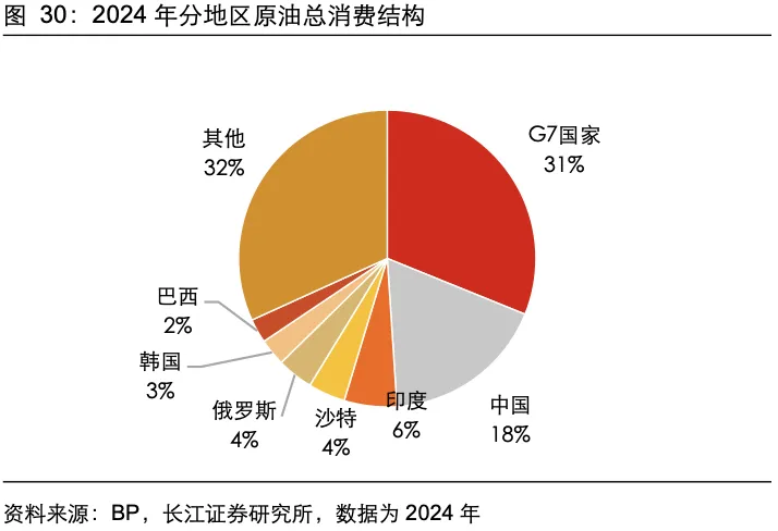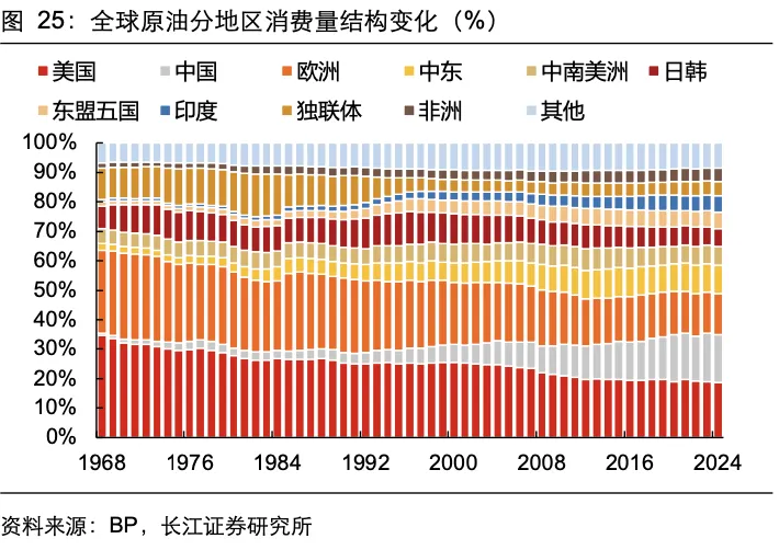 美国、欧洲与中国合计占据全球原油总需求的一半左右。从需求结构来看,美欧日等发达国家的原油消费占比从2000年的54%降至2024年的36%,而以中国为代表的新兴经济体需求占比持续上升。